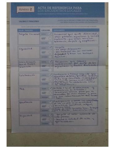 Acta de un encuentro local con resultados detallados de valores/principios; derechos; deberes y responsabilidades; instituciones y; memoria histórica.