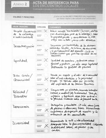 Acta de un encuentro local con resultados detallados de valores/principios; derechos; deberes y responsabilidades; instituciones y; memoria histórica.