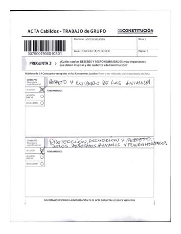 Acta de Cabildos provinciales. Trabajo en grupo perteneciente a la Provincia de Antofagasta, pregunta 3. Documento medianamente trabajado.