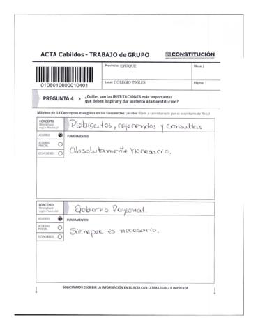 Acta de Cabildos provinciales. Trabajo en grupo perteneciente a la Provincia de Iquique (Iquique), pregunta 4. Bastante completo.