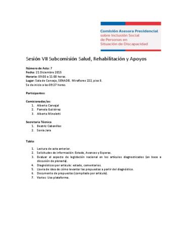 Acta de Sesión VII de Subcomisión de Salud, Rehabilitación y Apoyos que refiere a evaluación de aspecto de legislación nacional en los artículos diagnosticados y diagnósticos por artículo, entre otras temas. Se acuerda realizar un listado de problemáticas para luego realizar las propuestas y unificar criterios para tener un plan coherente, entre otras medidas. Asisten Sonia Jara, Beatriz Cabanillas y Alberto Minoletti.