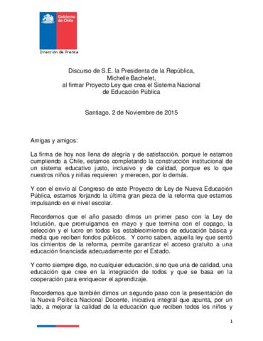 Discurso de Michelle Bachelet al firmar Proyecto Ley que crea el Sistema Nacional de Educación Pública