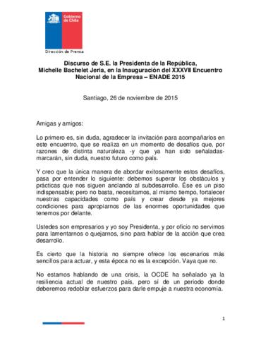 Discurso de Michelle Bachelet en la Inauguración del XXXVII Encuentro Nacional de la Empresa ENADE 2015