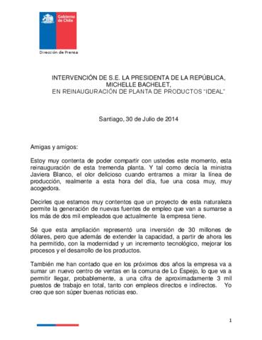 Intervención de Michelle Bachelet en Reinauguración de Planta de Productos IDEAL