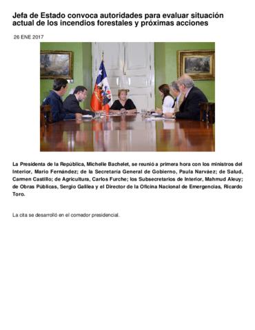 La Presidenta de la República, Michelle Bachelet, se reunió con los ministros del Interior, Mario Fernández; de la Secretaría General de Gobierno, Paula Narváez; de Salud, Carmen Castillo; de Agricultura, Carlos Furche; los Subsecretarios de Interior, Mahmud Aleuy; de Obras Públicas, Sergio Galilea y el Director de la Oficina Nacional de Emergencias, Ricardo Toro.
