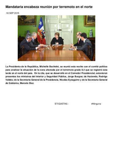 La Presidenta de la República, Michelle Bachelet, se reunió esta noche con el comité político para analizar la situación de la zona afectada por el terremoto grado 8,4 que se registró esta tarde en el norte del país. En la cita, que se desarrolló en el Comedor Presidencial, estuvieron presentes los ministros del Interior y Seguridad Pública Jorge Burgos, de Hacienda Rodrigo Valdés, de la Secretaria General de la Presidencia, Nicolás Eyzaguirre y de la Secretaria General de Gobierno, Marcelo Diaz.