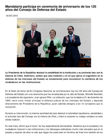 Mandataria participa en ceremonia de aniversario de los 120 años del Consejo de Defensa del Estado