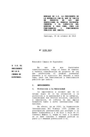Mensaje que inicia Proyecto de Ley que perfecciona el permiso posnatal parental y el ejercicio del derecho a sala cuna para las funcionarias y funcionarios públicos que indica