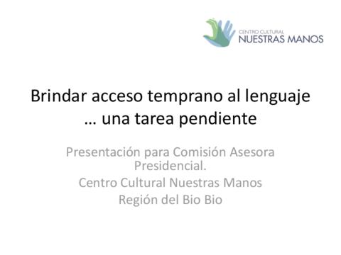 Presentan su propuesta de acceso temprano al lenguaje para las personas que presentan discapacidad auditiva, destacando la tarea pendiente del Estado en esta materia y la importancia de la enseñanza del lenguaje de señas para su desarrollo personal. Contiene resumen ejecutivo de la presentación.