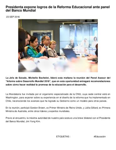 La Jefa de Estado, Michelle Bachelet, lideró esta mañana la reunión del Panel Asesor del Informe sobre Desarrollo Mundial 2018" , que en esta oportunidad entregará recomendaciones sobre cómo hacer realidad la promesa de la educación para el desarrollo. La Mandataria fue invitada por el organismo especializado de la ONU, cuya sede central está en Washington, para exponer sobre su experiencia en el diseño de la reforma que ha implementado en Chile, reconociendo los avances que ha logrado su Gobierno como un modelo para otros países. En la reunión, participó Gordon Brown, ex Primer Ministro de Reino Unido, y Jullia Gillard, ex Primera Ministra de Australia, entre otros líderes y expertos mundiales. Previo al encuentro, la máxima autoridad de nuestro país sostuvo una breve bilateral con el Presidente del Banco Mundial, Jim Yong Kim.