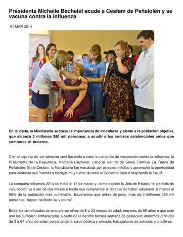 Presidenta Michelle Bachelet acude a Cesfam de Peñalolén y se vacuna contra la influenza