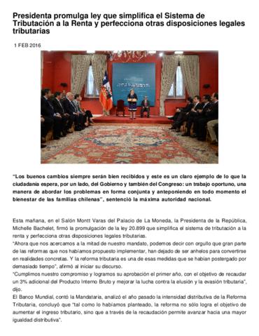 Presidenta promulga ley que simplifica el Sistema de Tributación a la Renta y perfecciona otras disposiciones legales tributarias