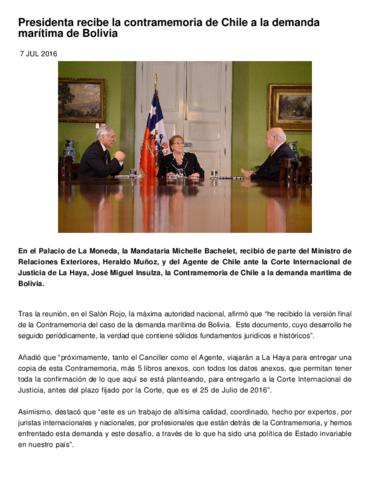 En el Palacio de La Moneda, la Mandataria Michelle Bachelet, recibió de parte del Ministro de Relaciones Exteriores, Heraldo Muñoz, y del Agente de Chile ante la Corte Internacional de Justicia de La Haya, José Miguel Insulza, la Contramemoria de Chile a la demanda marítima de Bolivia. Tras la reunión, en el Salón Rojo, la máxima autoridad nacional, afirmó que he recibido la versión final de la Contramemoria del caso de la demanda marítima de Bolivia. Este documento, cuyo desarrollo he seguido periódicamente, la verdad que contiene sólidos fundamentos jurídicos e históricos" .