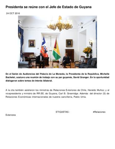 En el Salón de Audiencias del Palacio de La Moneda, la Presidenta de la República, Michelle Bachelet, sostuvo una reunión de trabajo con su par guyanés, David Granger. En la oportunidad dialogaron sobre temas de interés bilateral. A la cita también asistieron los ministros de Relaciones Exteriores de Chile, Heraldo Muñoz; y al vicepresidente y ministro de RR.EE. de Guyana, Carl B. Greenidge. Además del director (S) de Relaciones Económicas internacionales de nuestra cancillería, Pablo Urria.