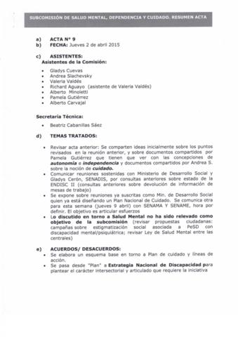 Resumen de Acta número nueve de Subcomisión Salud Mental dependencia y Cuidado de Comisión Asesora Presidencial sobre Inclusión Social de Personas en Situación de Discapacidad